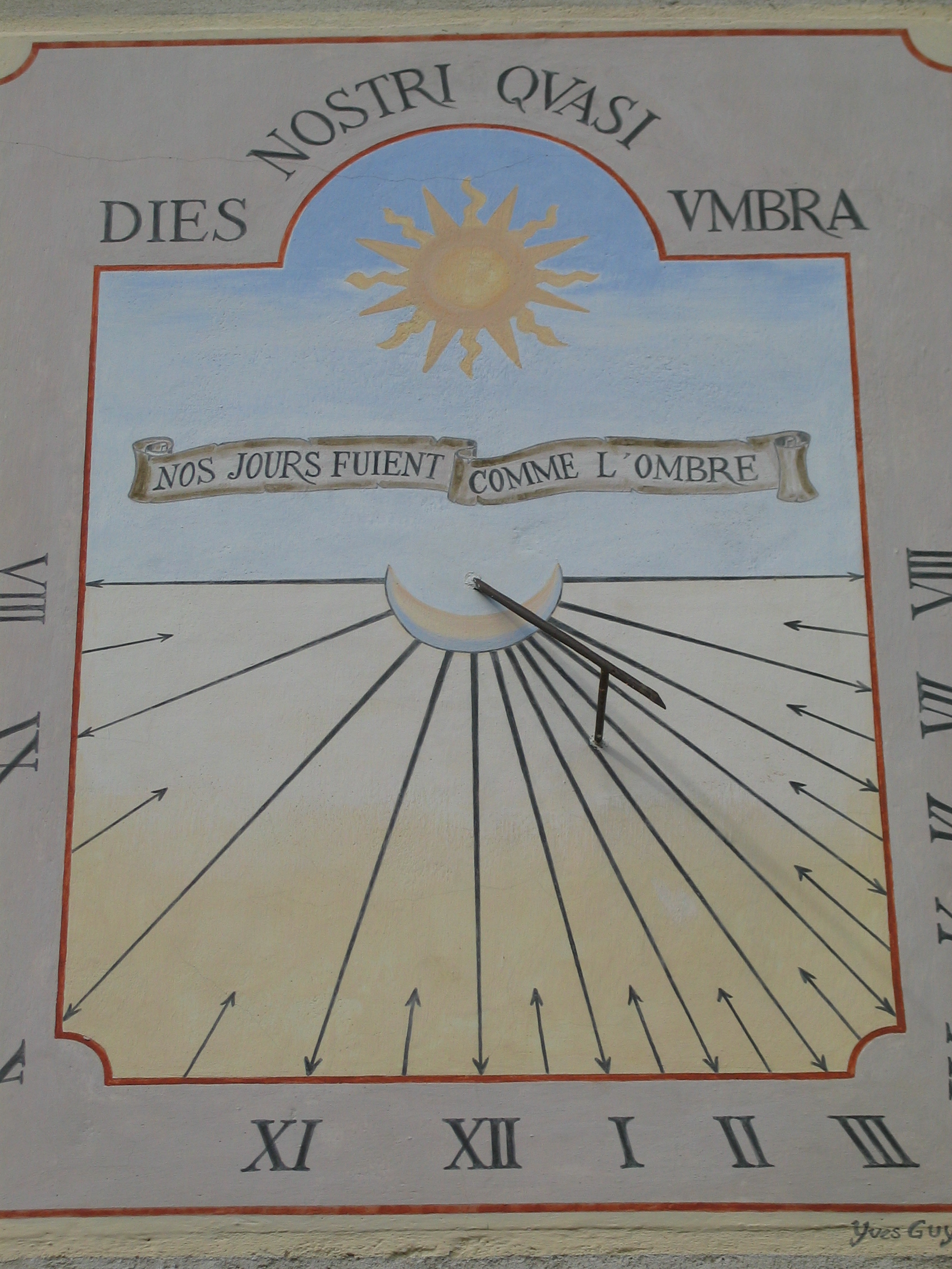 Le cadran a été calculé en fonction de la longitude et de l’inclinaison du mur de la cure : il indique l’heure solaire locale. Pour retrouver l’heure correspondant à votre montre, il faut donc corriger celle affichée au cadran en fonction de ces paramètres. Pour cela, procédez comme suit: